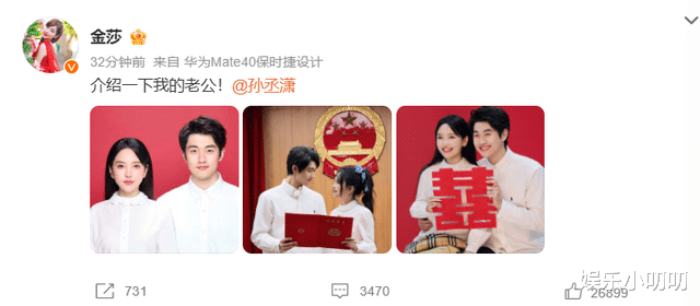 二人的官宣文案也是很甜蜜分别介绍了自己的老公和老婆,43岁的金莎不愧有“甜妹”称号,和孙丞潇站在一起真的毫无违和感,少女感十足。两人晒出的领证照,隔着屏幕都能溢出来。近日两人又参加了综艺节目《妻子的浪漫旅行》录制,很多人猜测两人是不是为了节目才领证,对于此质疑,两人在节目中也给出了明确回应,称不会拿婚姻大事当儿戏。