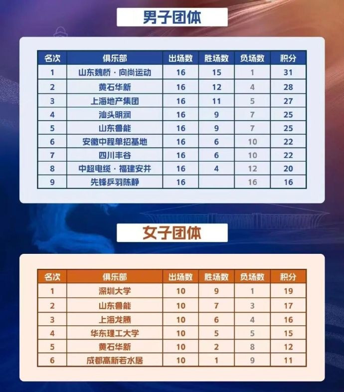 男团方面,王楚钦所在的山东魏桥排名第一晋级总决赛,许昕等名将所在的上海地产集团排名第二。
