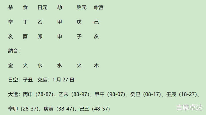 看这个运程的话,壬辰运(18-27)的时候则是食神被合,杀攻身而不佳。过了这个壬辰运则是会转好。