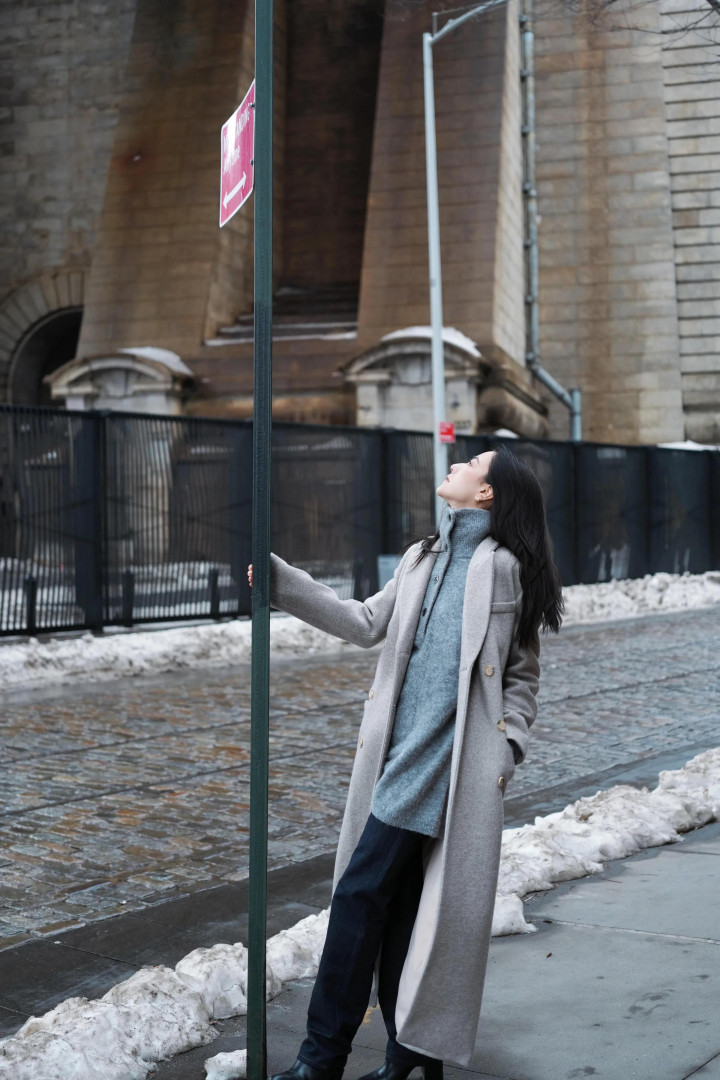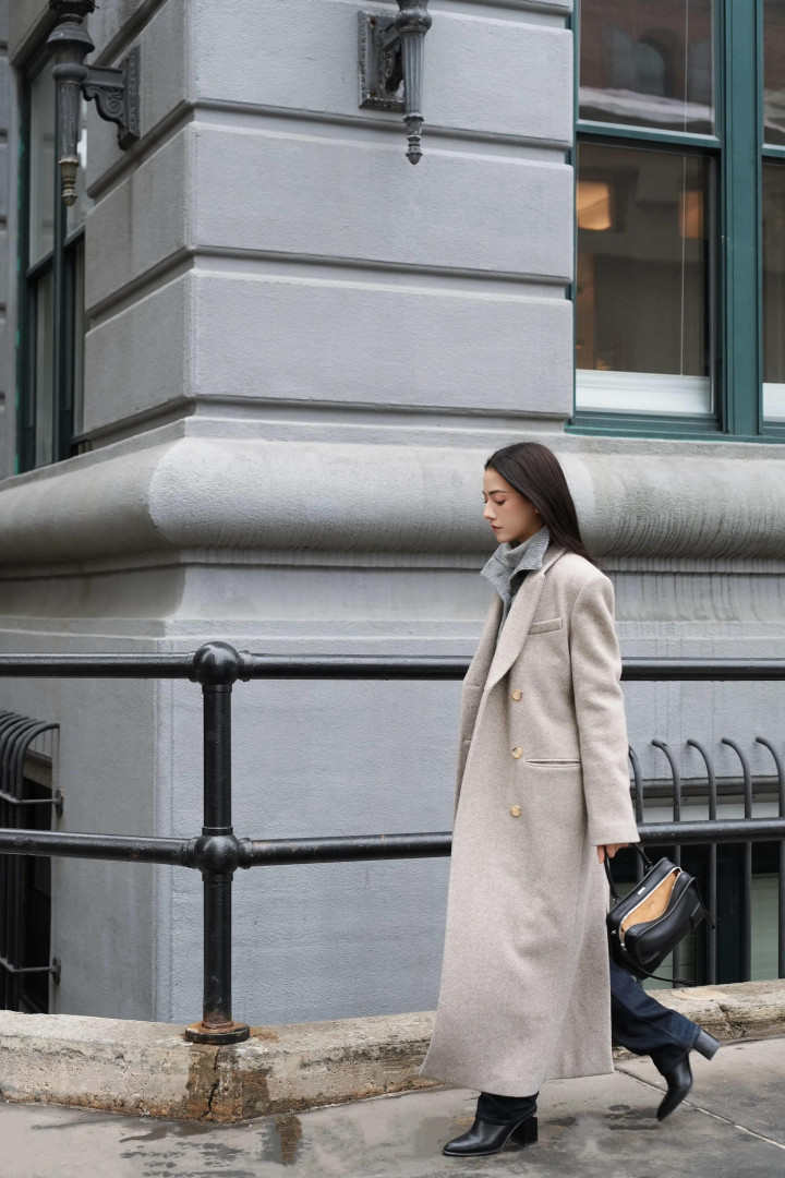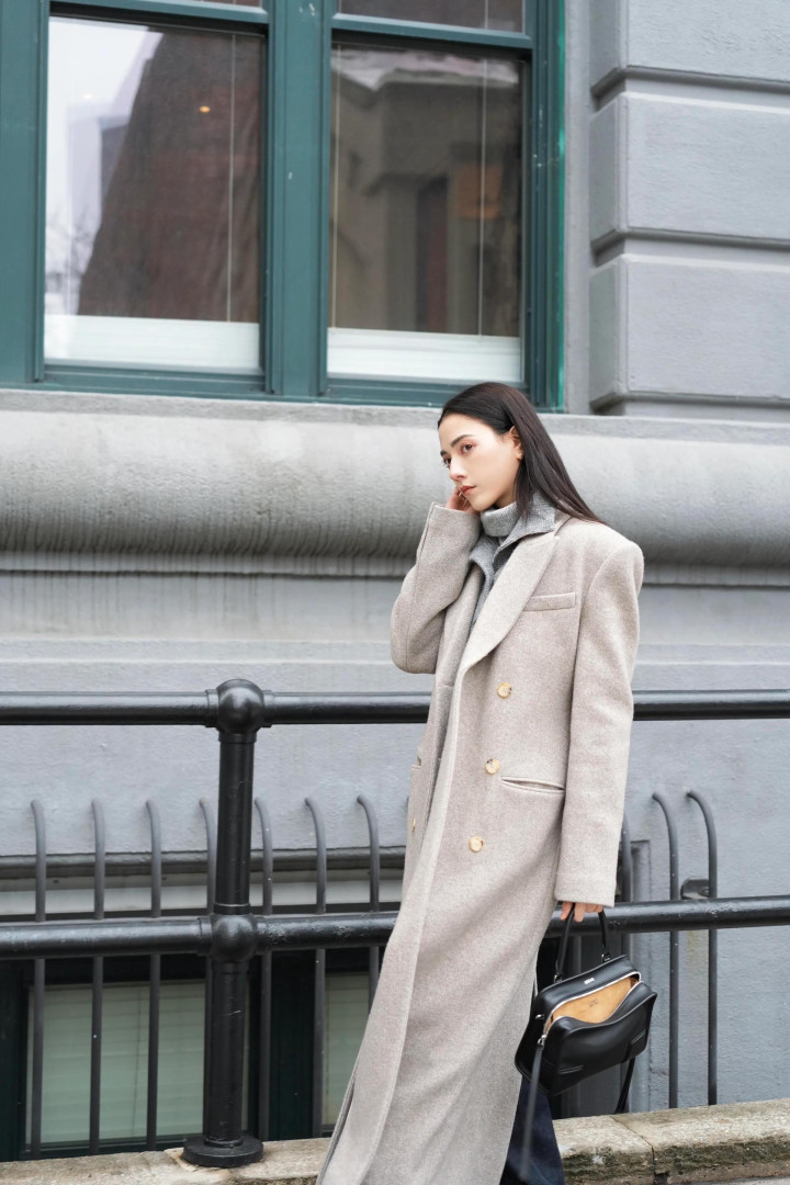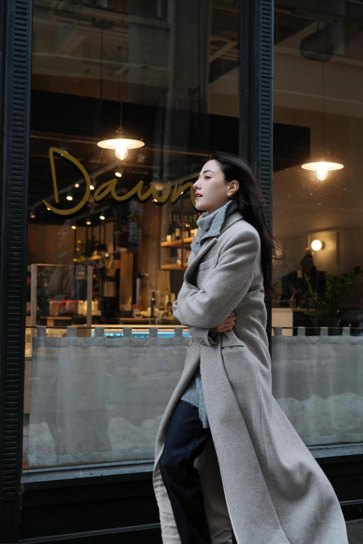 娜然很喜欢这件长款的浅灰色呢大衣,她去纽约的时候也穿的这件大衣。娜然和霍启山约会的时候穿了红色羊毛衫,热烈喜庆,在纽约工作时她就用灰色高领毛衣搭配这件大衣,同一件大衣穿出两种完全不同的时髦感,她的衣品很好。