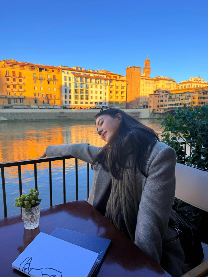 娜然在社交媒体上发出了一些库存照片,其中有几张是她和霍启山在意大利弗洛伦斯旅行时拍到的。那天她的灰色大衣下搭配的是一件红色的羊毛衫,她单手托腮朝着霍启山笑的很甜,他俩越看越般配。