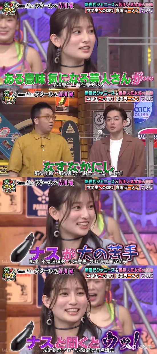 主持人问她有没有喜欢的艺人,她说某程度上算是有在意的艺人,结果原来是因为她很讨厌“茄子(なす)”,而这个艺人的名字跟“なす”同音哈哈哈哈!