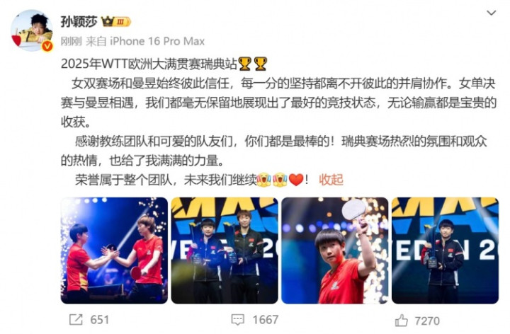 在个人社媒,孙颖莎发文写道: