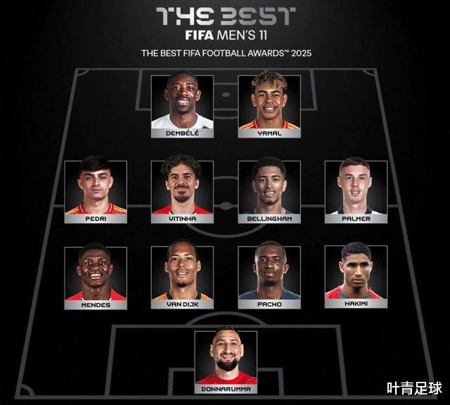 FIFA年度最佳阵容的442阵型,双前锋是亚马尔、登贝莱,中场是佩德里、维蒂尼亚、贝林厄姆、帕尔默。论个人表现,拉菲尼亚取代贝林厄姆、帕尔默,完全没问题。
