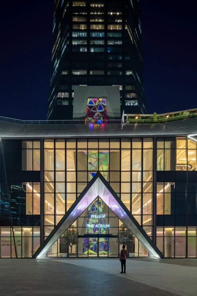 入口区域同样延续了钻石主题的精致感。落客区与景观带通过层次分明的灯光布置,营造出温馨且高级的氛围。植物与水景在向上照明的烘托下显得生动而立体,而金属“V”形门框则借助巧妙的反射效果,为步入中庭的访客带来充满仪式感的体验。