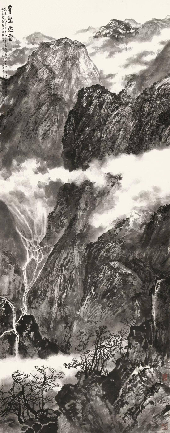 还有那飞瀑,如银练垂空,从山间奔涌而下,打破了画面的静谧,带来了勃勃生机。水流的线条流畅而富有张力,与周围的墨色山峰、白色云雾形成鲜明对比,更显其灵动与欢快,似是在为这天地大梦奏响一曲激昂的乐章。山脚下的林木,枝干虬曲,虽无绿叶点缀,却也以简洁的笔墨,展现出顽强的生命力,为这幅雄浑的山水,添了几分生机与野趣。