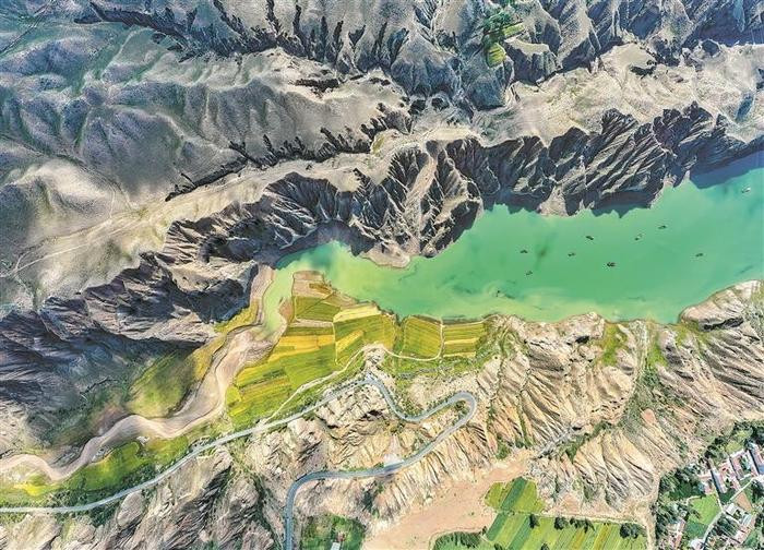 位于海南藏族自治州共和县境内的龙羊峡拥有世界上最典型、分布面积最大的第三系地层风化形成的土林景观。其龙羊峡景区,目前已开放的有黄河大峡谷、龙羊湖、土林地质公园、龙羊大峡谷四个景点,游客可以乘船一睹“高原古水道”的风采,感受大峡谷“奇、幽、深、异、险、秘”的奇景。图为记者9月6日无人机航拍龙羊峡景区鸟瞰图。本报记者洪玉杰摄